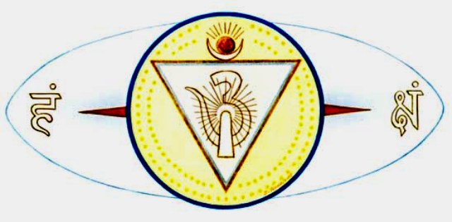 35- Dentro do triângulo deste Cakra está a combinação das letras A e U que formam o Praṇava (OṂ), o Bīja mantra do Cakra Ājña. O Ātmā interior é como uma mente pura (Buddhi), e se assemelha a uma chama em seu esplendor. Acima dele está a lua crescente, e acima dela está Ma-kara (a letra Ṃ), brilhando em sua forma de Bindu. Ainda, cima dela, está o Nada difundindo seus raios.